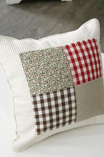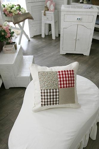 用四块不同图案的碎花、条纹拼布,搭配出大面积的四格图案,让靠垫的正面充满田园的质朴和温馨。纯朴的碎花和格纹带着独特的乡村感觉,不会破坏田园风格的自然味。