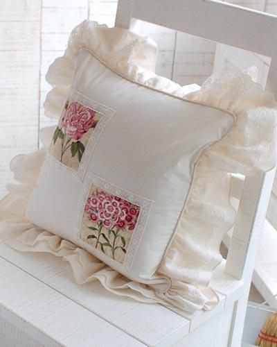两块玫瑰图案的小拼布,温馨柔美的粉色让这片纯白中增添了一抹亮丽色彩,同时又不是甜美浪漫的感觉。细腻的蕾丝边像复古的相框,把两块拼布围绕其中。就像雪白的墙上挂着两幅优雅的装饰画,简洁而又美观。