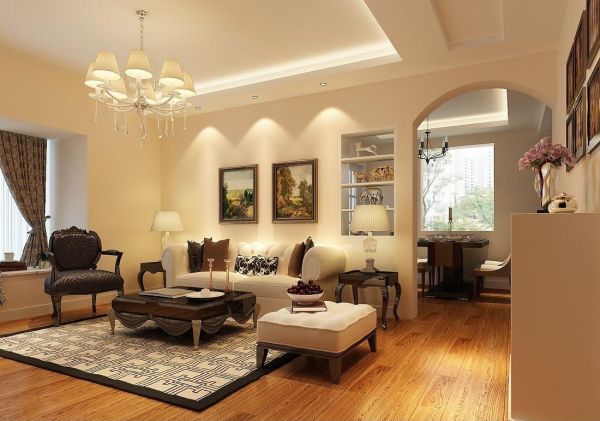 1.欧式风格向我们展示了一种华丽的装饰,给我们带来了强烈的色彩和精致的造型感。客厅顶部通常用大灯池装饰,整个客厅氛围通过华丽的枝形吊灯适当营造。