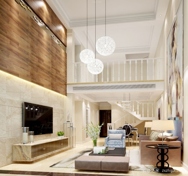 对于复式住宅,由于分为上下两层,客厅显得更加透明、宽敞,需要通过家具、配件装饰、丰富的空间,如一些书法、绘画、一些绿色植物,可以让客厅显得充满活力,充满家的感觉。同时,对客厅的功能进行明确、合理的分类,使我们的家庭生活更加方便、舒适。
