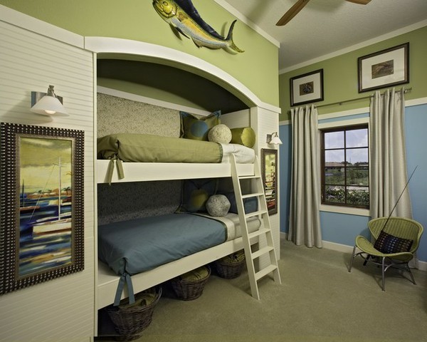 很多儿童房面积小。如果安排两张平床,空间会更窄。一般来说,最好选择上下铺。但上铺楼梯的设计必须安全,上铺护栏必须高,以免孩子掉在地上。此外,还应考虑儿童房的线条搭配,因为这些因素的效果非常奇妙,如床的曲度、墙壁和衣柜的直线等,可以使儿童房充满童趣。